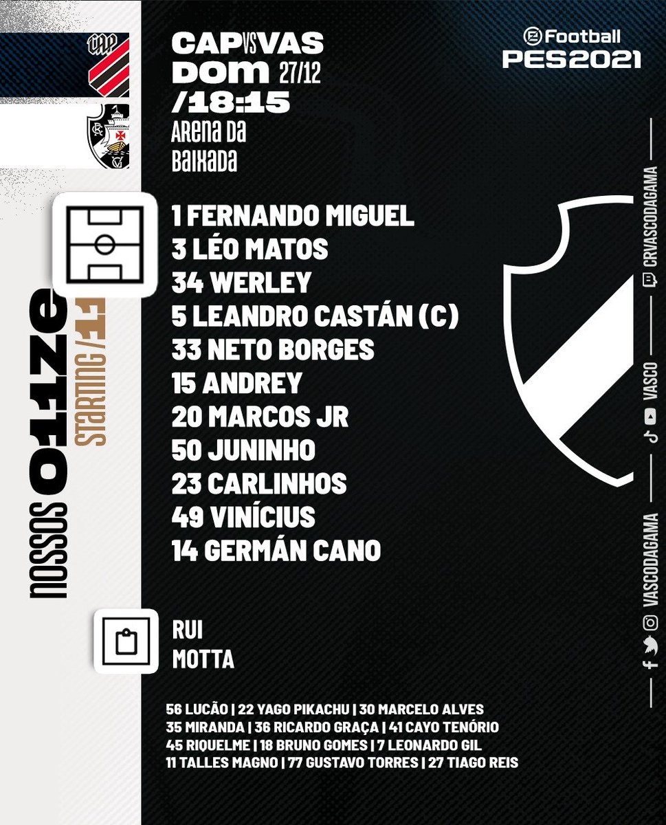 O Vasco está escalado para a partida contra o Athletico-PR. Werley é titular na zaga, ao lado de Castan. E Juninho começa jogando. #BaixadaENM