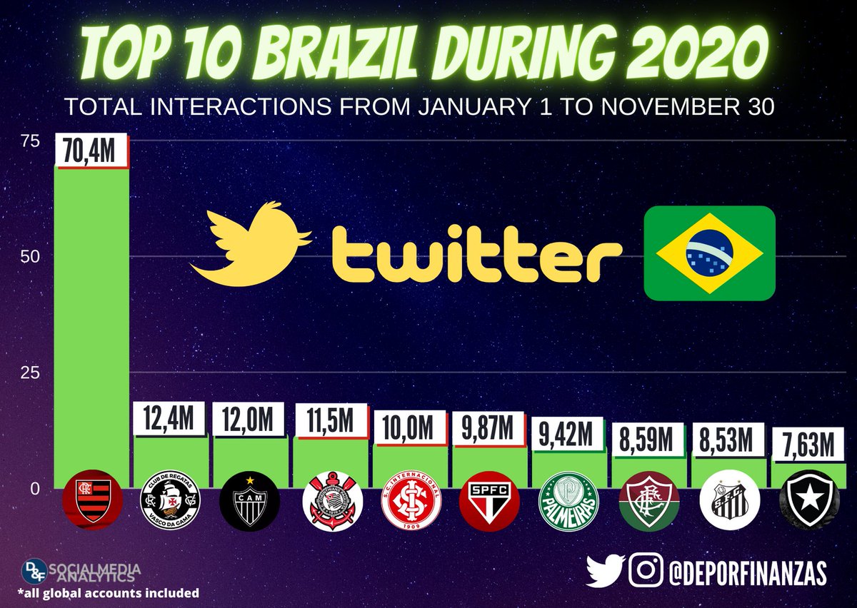 ?⚽?? Os 10 clubes brasileiros com mais engajamento no #twitter durante 2020! (janeiro-novembro)