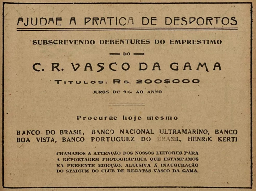 Na ocasião o Correio da Manhã de 10 de abril de 1927 (11 dias da inauguração de SJ) soltou um manifesto para a emissão de 25K debêntures ao portador no valor de 200 Rs (Réis). Havia a necessidade de equilibrar as finanças e cumprir algumas obrigações com o nosso Estádio.?