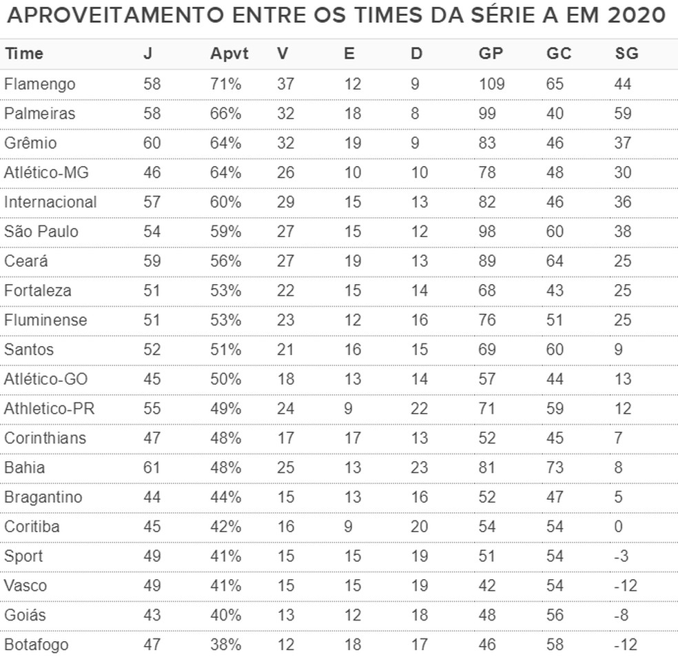 Confira o ranking de aproveitamento dos times da Série A em 2020, considerando apenas as competições oficiais disputadas (sem amistosos):