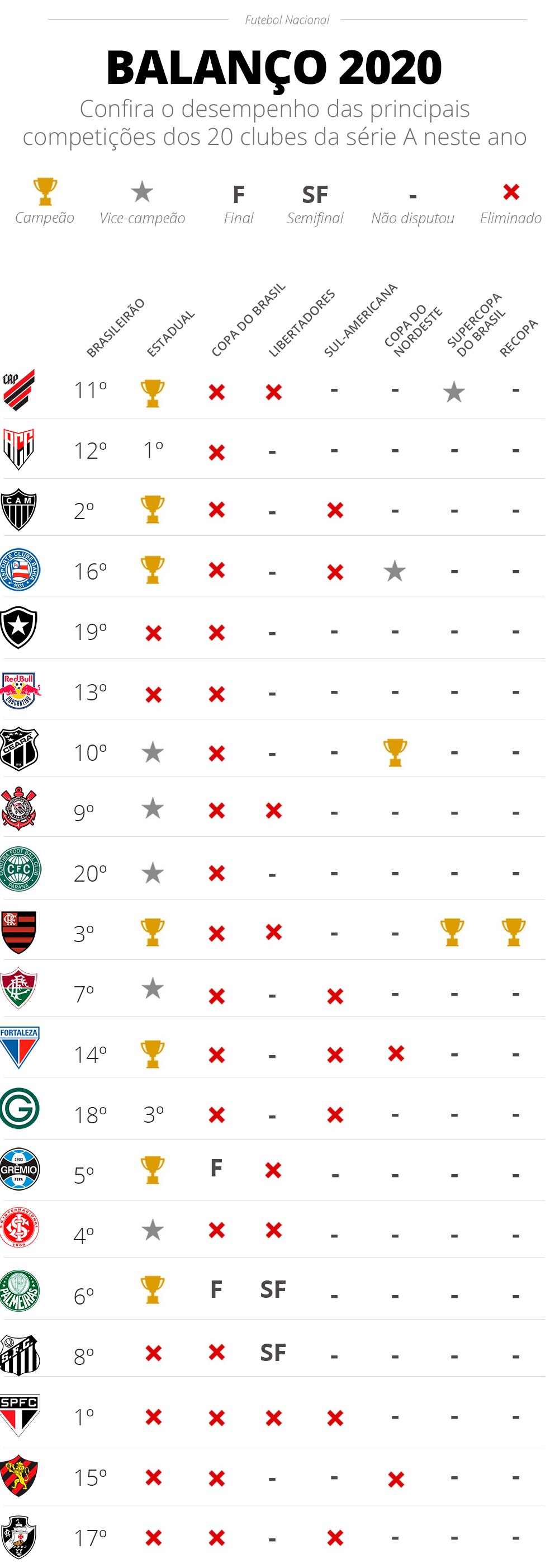 Confira como o seu time se saiu em cada competição oficial de 2020: