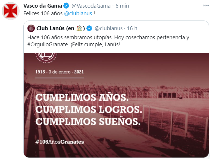 Vasco parabeniza o Lanús-ARG pelos seus 106 anos
