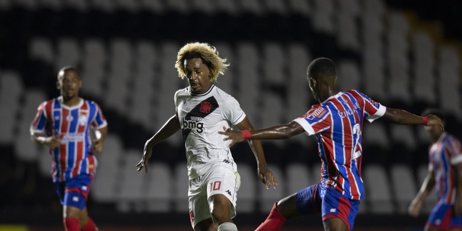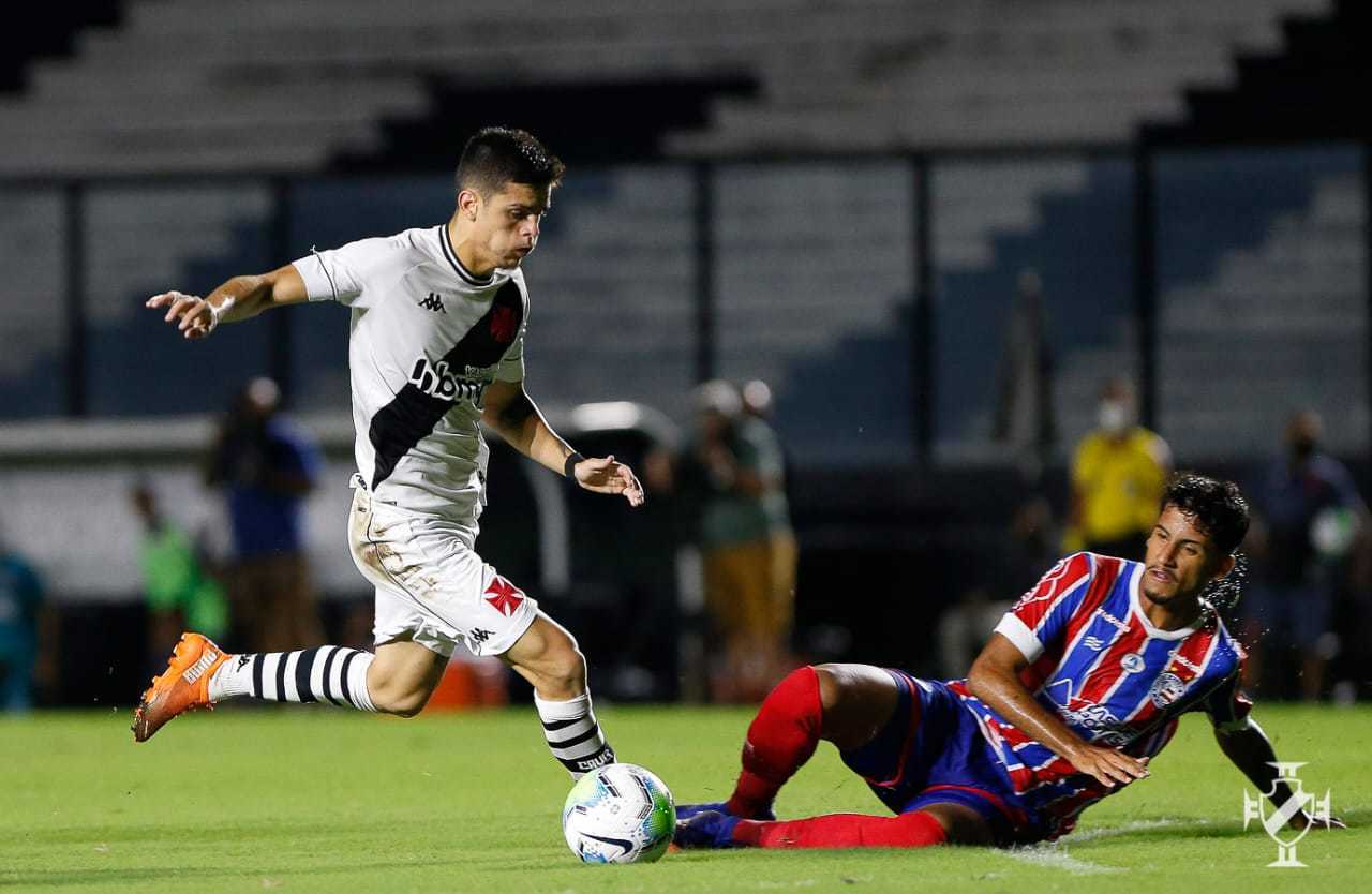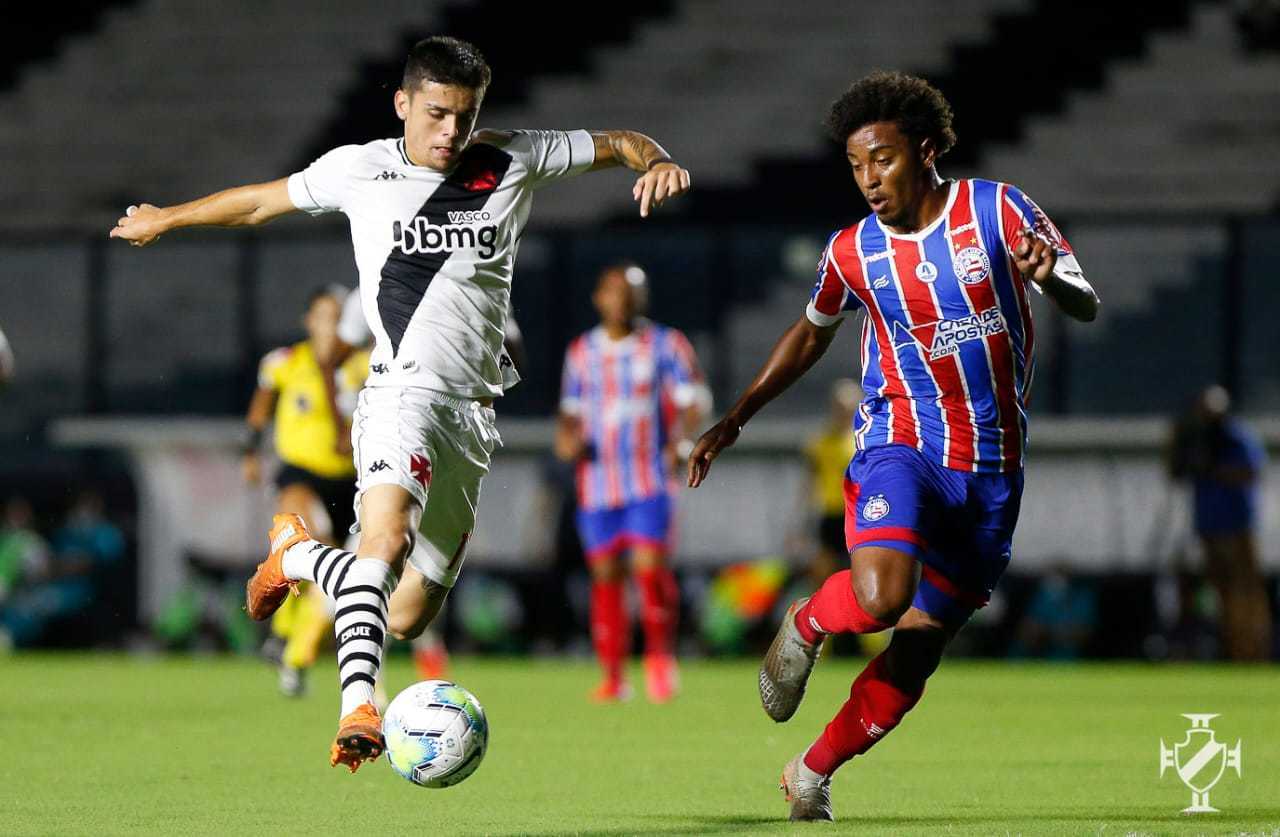 A primeira etapa começou equilibrada no Rio de Janeiro, com o Bahia levemente mais ofensivo. No entanto, o Vasco se lançou ao ataque e teve um gol anulado aos 12 minutos: Riquelme achou Gabriel Pec, que marcou, mas a bola desviou no braço de Caio Lopes antes da finalização. Depois do susto, o Esquadrão de Aço respondeu em chute de Daniel da entrada da área defendido por Cadu. Porém, o Gigante da Colina balançaria novamente a rede - desta vez, sem qualquer irregularidade. Aos 25, Gabriel Pec fez belíssima jogada, deixou a zaga do Tricolor para trás e tocou para Laranjeira, que só completou para a meta vazia.