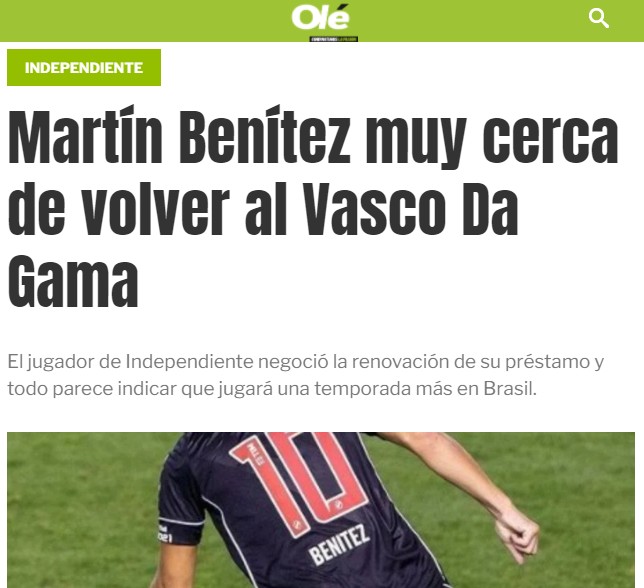 Martín Benítez regresó a Argentina el 31 de diciembre, luego de que finalizara su vínculo con el Vasco Da Gama, donde se encontraba a préstamo, y el club no brasileño no hiciera uso de la opción de compra. Sin embargo, el futbolista de 26 años, le manifestó a Independiente, dueño del pase, su deseo de seguir en el conjunto de Río de Janeiro y todo parece indicar que su préstamo sería renovado.