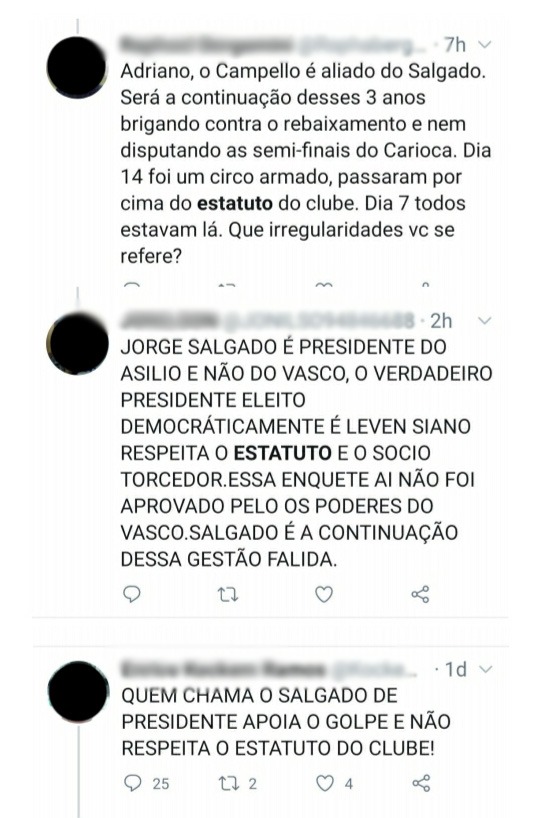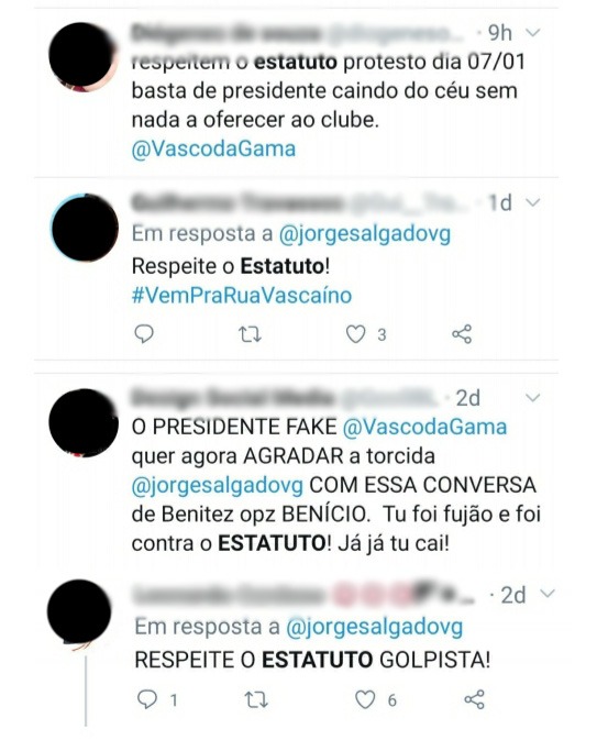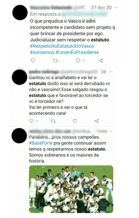 Há perfis que tiveram seus prints colocados mais de uma vez no documento – chegando a um perfil ser repetido quatro vezes, apesar das mensagens serem diferentes. Algumas enquetes feitas por perfis de páginas sobre o Vasco também tiveram seus prints colocados como prova nesta ação, que ficou com o ministro Dias Toffoli como o relator do julgamento da Arguição de Descumprimento de Preceito Fundamental (ADPF) no STF. Uma manifestação é esperada para esta sexta-feira nos autos.