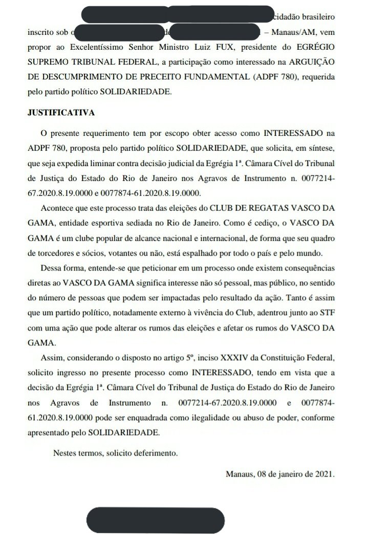 Uma pessoa de Manaus, agora há pouco, peticionou nos autos da ação do Solidariedade sobre a eleição do Vasco no Supremo Tribunal Federal pedindo ao ministro presidente Luiz Fux a participação como interessado. Segue a expectativa por uma decisão do caso no STF. Espia #VascoENM