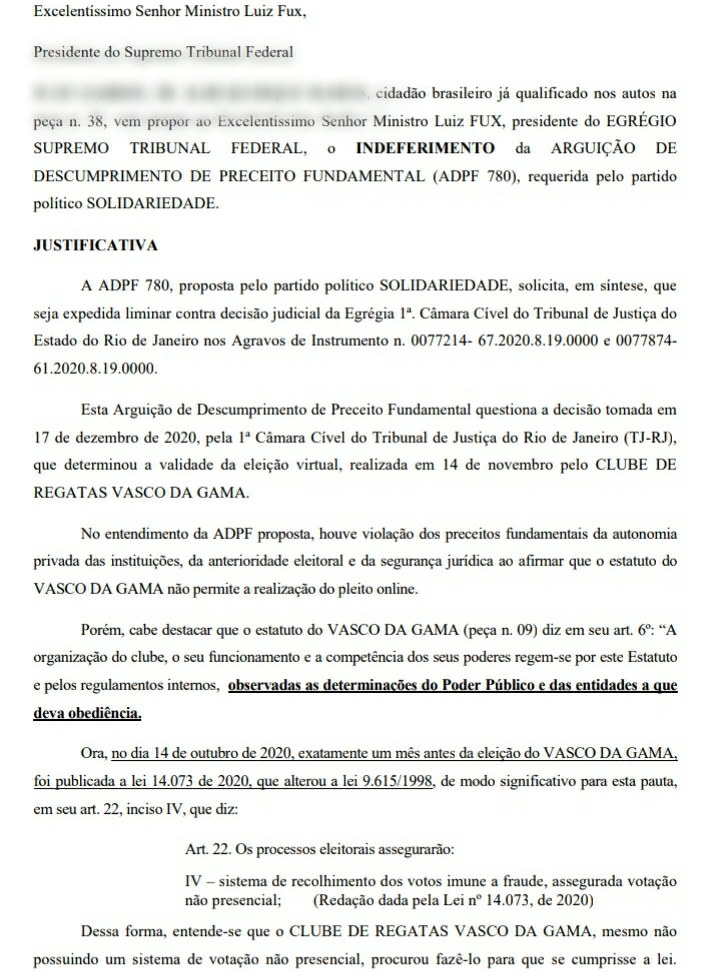 Após na última sexta-feira pedir para participar como interessado, conforme o Esporte News Mundo antecipou, um cidadão de Manaus pediu na madrugada desta terça-feira ao Supremo Tribunal Federal (STF) para que a ação do Solidariedade seja indeferida e, consequentemente, Jorge Salgado mantido como novo presidente do Vasco para o triênio 2021-2023 – e não Leven Siano como solicitado pelo partido político.