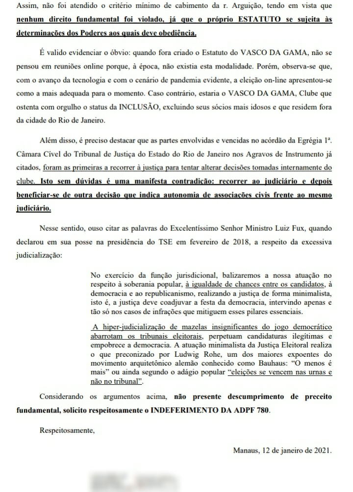 "É valido evidenciar o óbvio: quando fora criado o Estatuto do VASCO DA GAMA, não se pensou em reuniões online porque, à época, não existia esta modalidade. Porém, observa-se que, com o avanço da tecnologia e com o cenário de pandemia evidente, a eleição on-line apresentou-se como a mais adequada para o momento. Caso contrário, estaria o VASCO DA GAMA, Clube que ostenta com orgulho o status da INCLUSÃO, excluindo seus sócios mais idosos e que residem fora da cidade do Rio de Janeiro", argumentou o cidadão em sua petição.