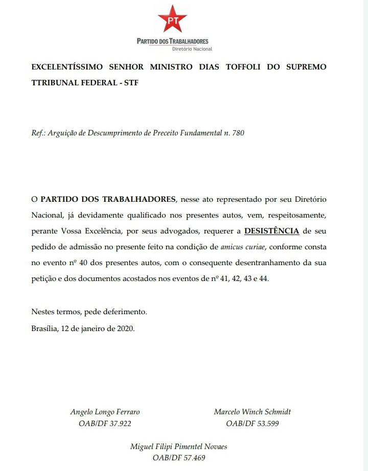 Às 12h35 desta terça-feira, o Partido dos Trabalhadores (PT) protocolou no Supremo Tribunal Federal (STF) desistência de participação na ação do Solidariedade favorável a Leven Siano na eleição para presidente do Vasco no triênio 2021-2023. O Esporte News Mundo teve acesso a detalhes do caso – confira a seguir a petição do Diretório Nacional.