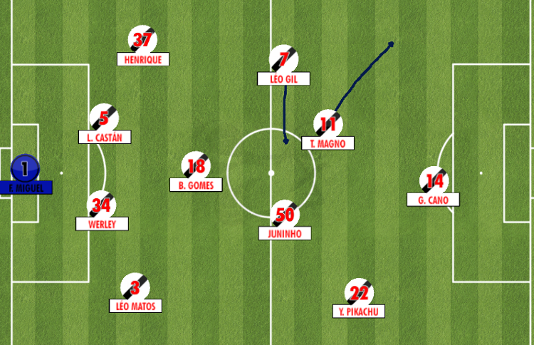 Para que Talles tenha essa liberdade e varie o posicionamento, o argentino Léo Gil tem sido fundamental. Ele é que abre para a ponta no momento defensivo em muitos momentos. Mesmo sem tanta mobilidade, se desdobra para acompanhar o lateral-direito adversário e dar mais condições de atacar ao jovem ponta.