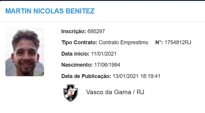 A CBF publicou há pouco a nova inscrição de Martín Benitez no BID. Desta forma, o meia argentino está apto a reaparecer no time do Vasco na partida contra o Coritiba no sábado, em São Januário. Benitez treina com os demais jogadores. Resta saber se Vanderlei irá utiliza-lo...