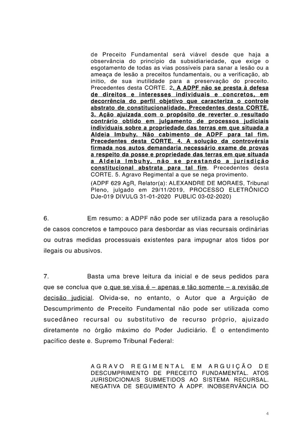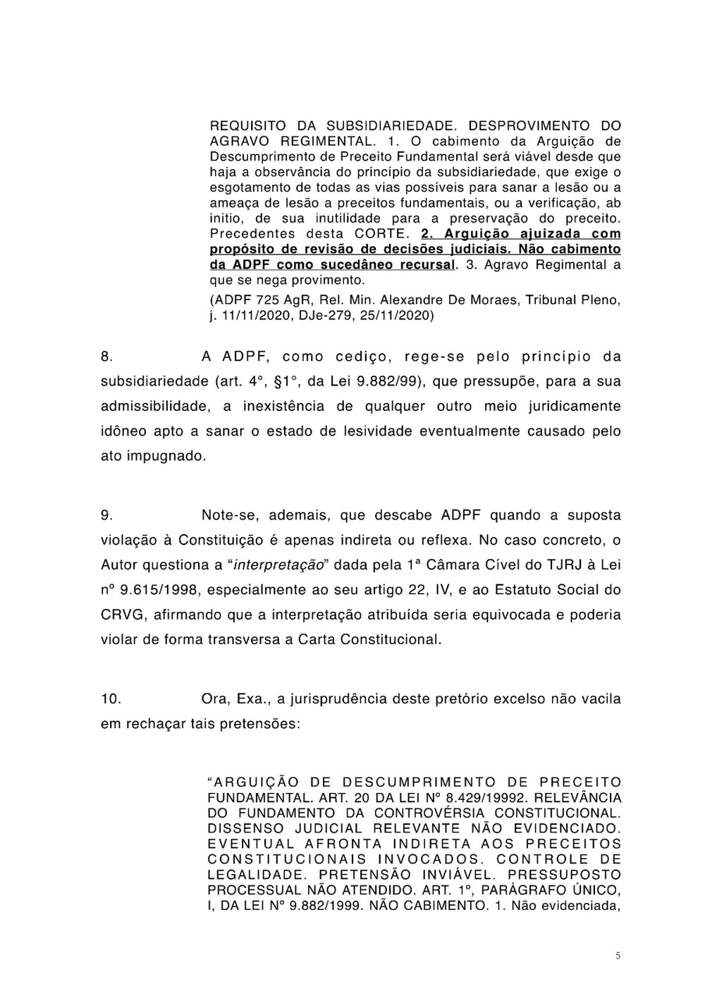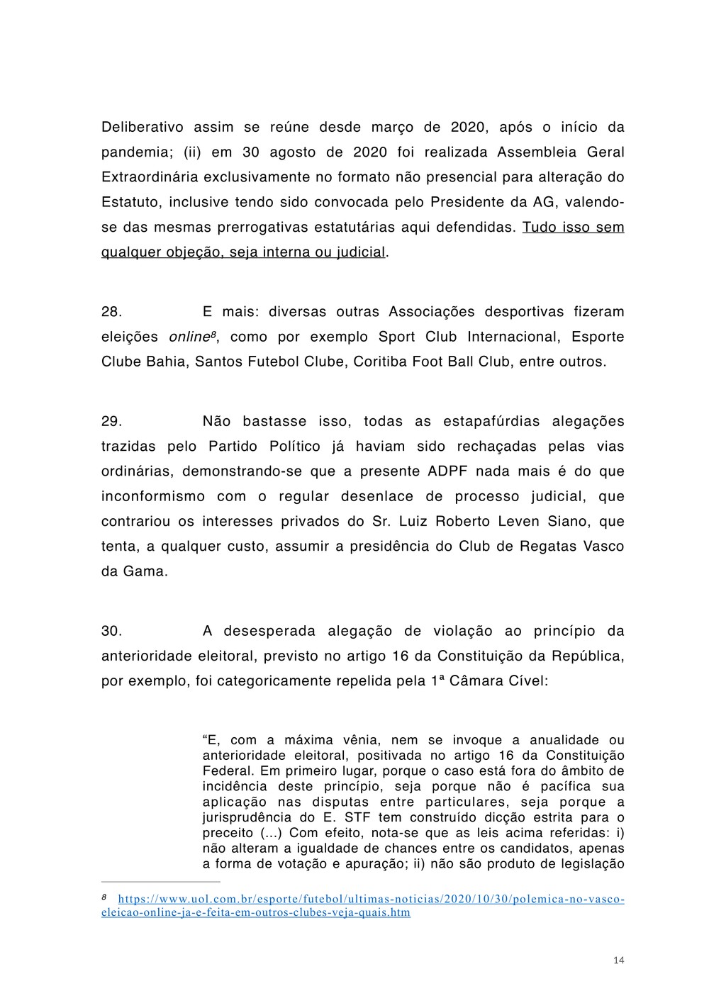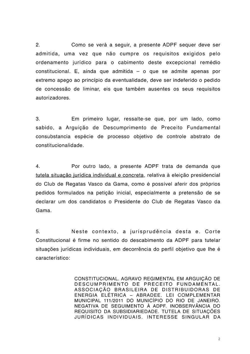"Não bastasse isso, todas as estapafúrdias alegações trazidas pelo Partido Político já haviam sido rechaçadas pelas vias ordinárias, demonstrando-se que a presente ADPF nada mais é do que inconformismo com o regular desenlace de processo judicial, que contrariou os interesses privados do Sr. Luiz Roberto Leven Siano, que tenta, a qualquer custo, assumir a presidência do Club de Regatas Vasco da Gama".