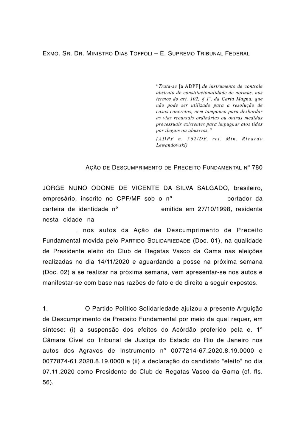 Presidente eleito do Vasco após decisão de colegiado de juízes do TJ/RJ no último dia 17, Jorge Salgado fez petição ao Superior Tribunal Federal para a retirada da ação no mesmo STF movida pelo partido Solidariedade, que pede que Luiz Roberto Leven Siano seja empossado na próxima semana. O portal "Esporte News do Mundo" publicou a informação primeiramente.