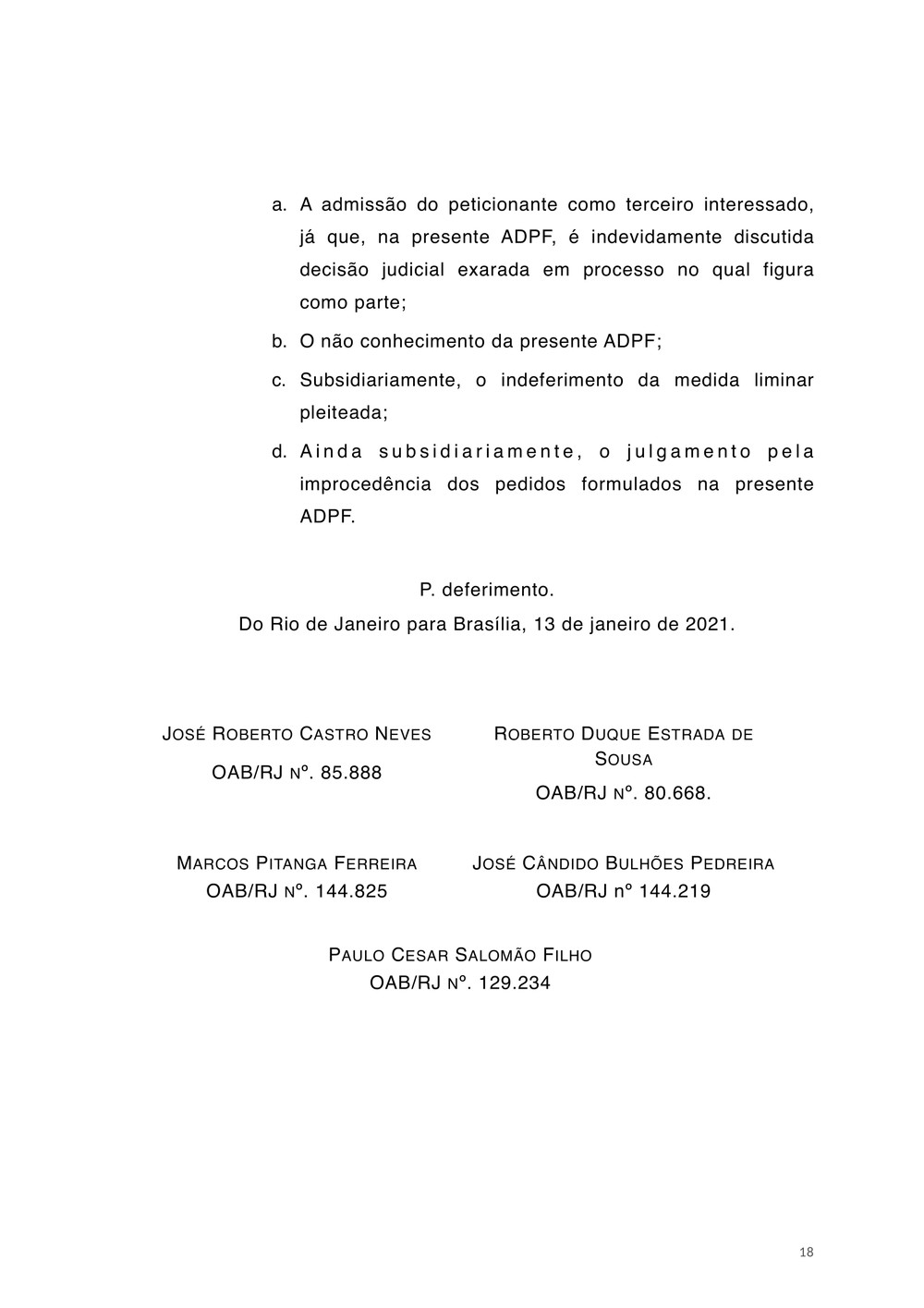Em extenso documento composto por 18 folhas, a defesa de Salgado sustenta que a Ação de Descumprimento de Preceito Fundamental (ADPF) movida pelo partido Solidariedade a fim de empossar Leven Siano como presidente é indevida.