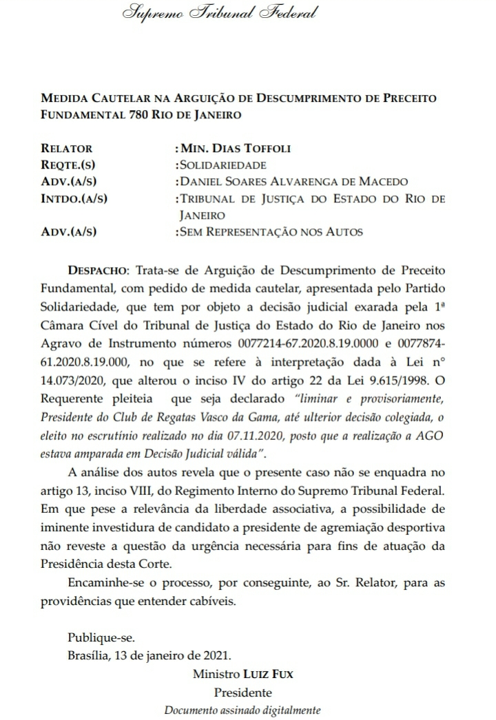 Veja a íntegra da decisão do ministro Luiz Fux na ação do Solidariedade no STF sobre a eleição do Vasco