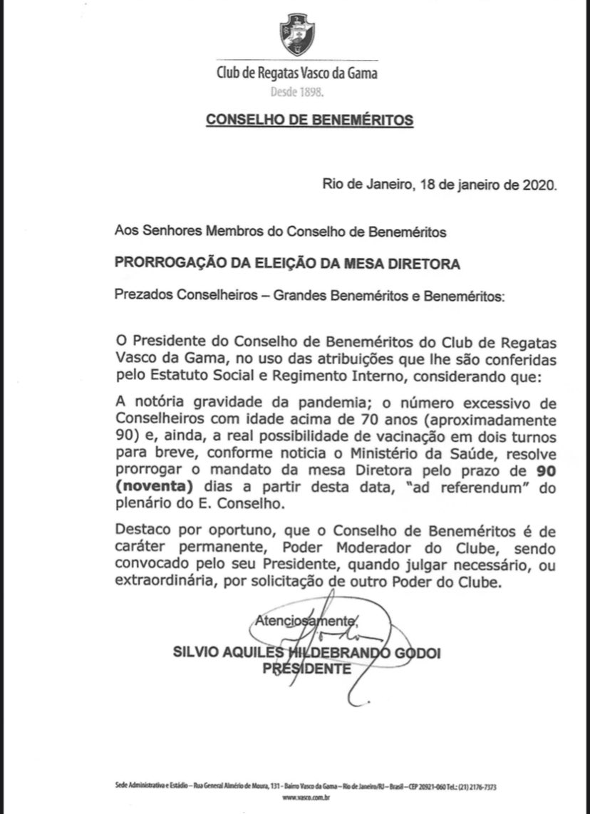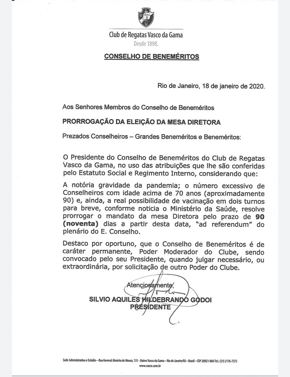 O presidente do Conselho de Beneméritos do Vasco, Silvio Godoi, determinou que o mandato da atual mesa diretora, que acabaria na segunda quinzena de janeiro, seja prorrogado por mais 90 dias. Com isso, a eleição para presidência do poder está adiada. Ele e o vice José Luis Moreira fazem parte da atual mesa.