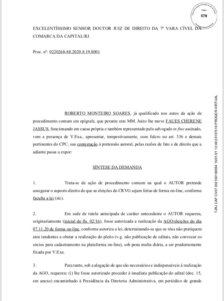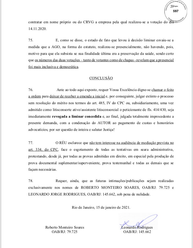 "Isso porque, o Sr. LUIZ ROBERTO LEVEN SIANO, além de sócio, foi candidato e elegeu-se Presidente do CRVG na eleição realizada presencialmente no dia 07.11.2020, detendo notório interesse jurídico na sentença deste processo, que inegavelmente atinge a sua esfera jurídica. (…) Note-se que, dentre os beneficiários da teratologia, está o Senhor JORGE SALGADO, alçado – ilegitimamente – à condição de Presidente do CRVG. Com isso, ele passará, à um só tempo, a condição de interessado – que deve integrar o polo ativo em listisconsórcio com o AUTOR (cf. fls.534/537) – e RÉU, já que estará respondendo pelo CRVG nos termos do art. 99, I e II do Estatuto", argumentou em trecho da petição.