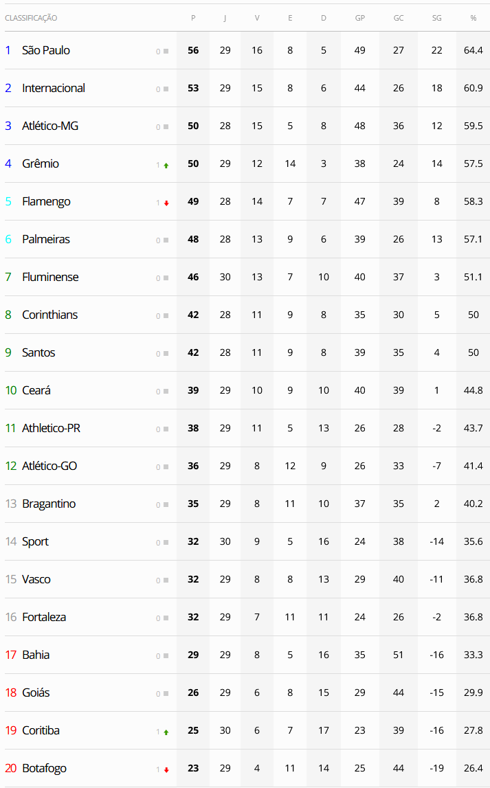 Veja como ficou a classificação do Brasileiro após os jogos de sábado da 30ª rodada, com a derrota do Vasco para o Coritiba por 1 a 0.