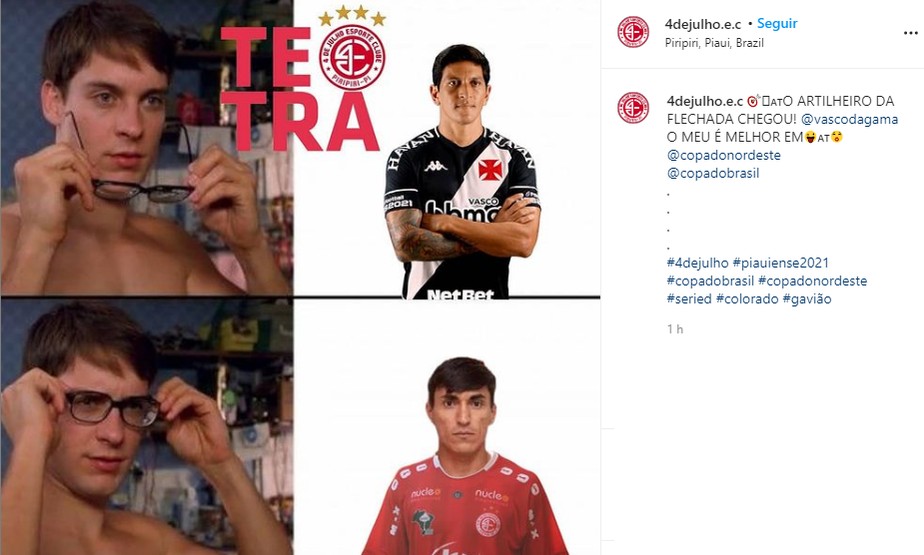 A nova contratação foi celebrada com um meme nas redes sociais no perfil do clube de Piripiri, no Piauí, que viu semelhança com o atacante Cano, do Vasco. Parece?