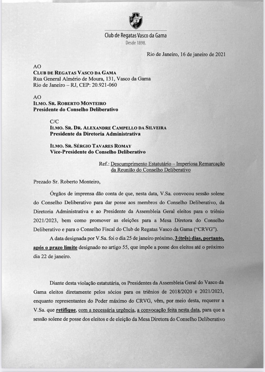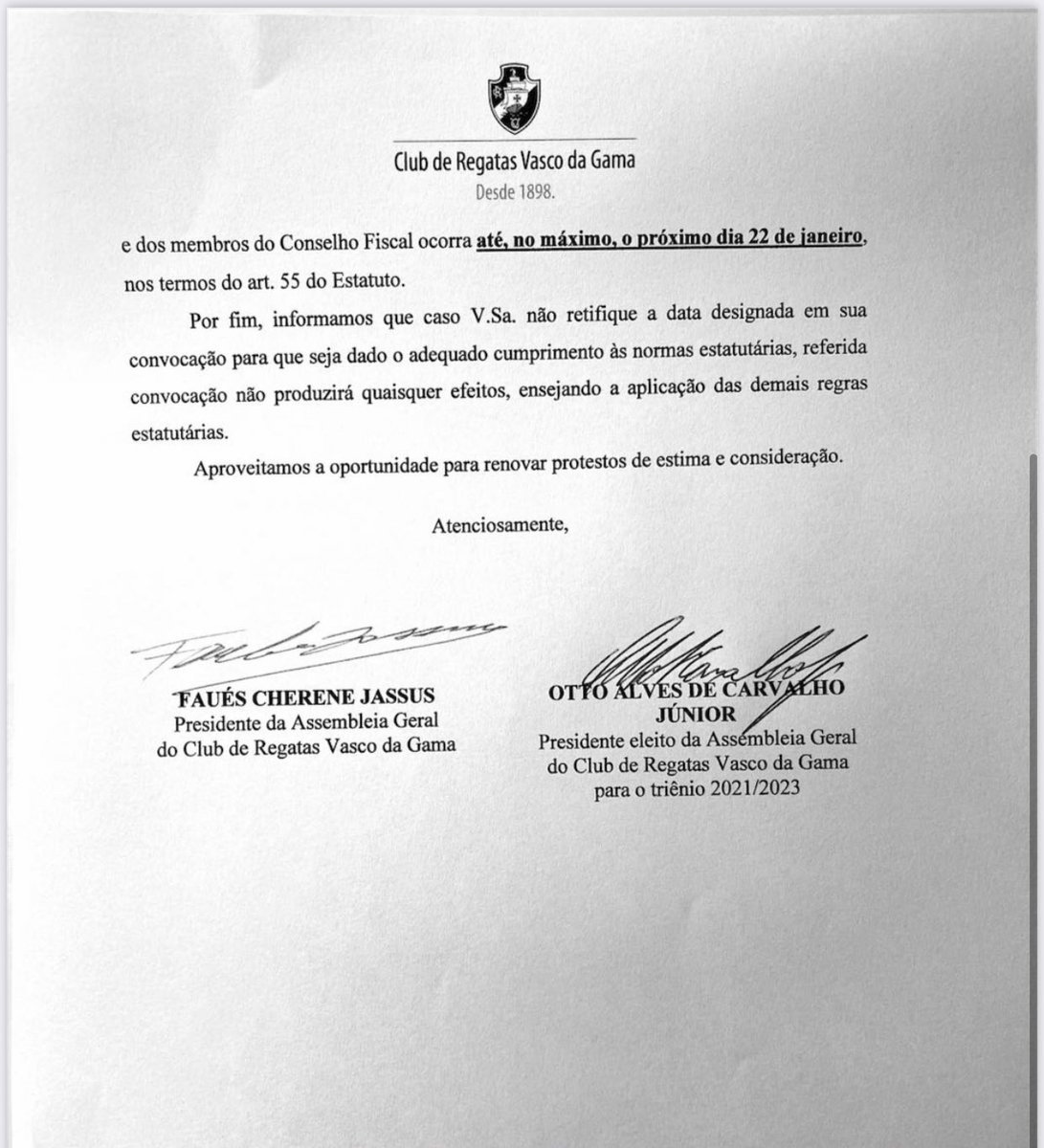 Presidentes da AG da atual e da futura gestão do Vasco, Mussa e Otto emitiram comunicado solicitando que Roberto Monteiro retifique a data da convocação da posse para, no máximo, o dia 22