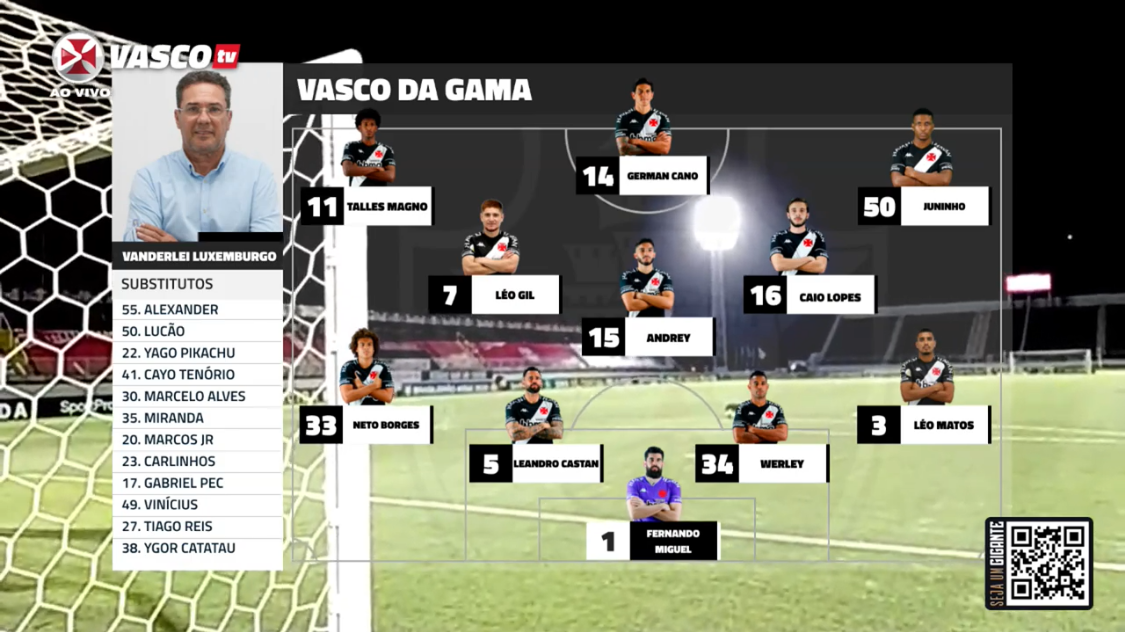 20:29 - Confira a escalação do Vasco; Neto Borges, Andrey e Caio Lopes são titulares e Yago Pikachu vai para o banco