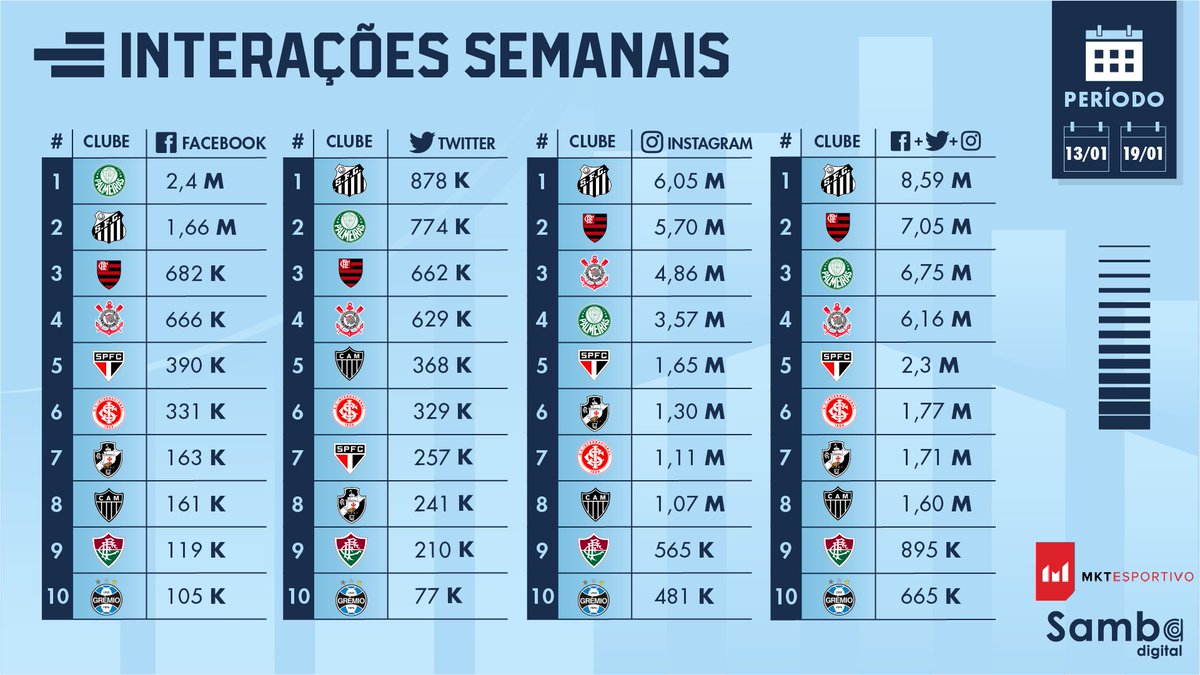 Com 8.59 milhões de interações, o @SantosFC encabeça o ranking da semana. O Peixe se tornou o quarto time a alcançar o topo de métricas desde que ele foi criado.