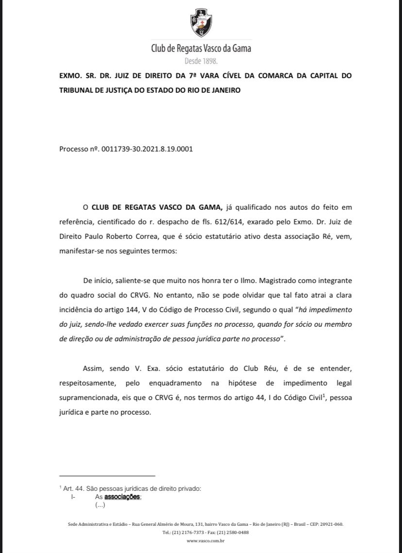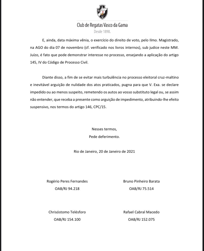O Vasco da Gama protocolou um pedido no processo ao juiz Paulo Roberto Correa (responsável por julgar a ação dos 12 sócios que querem a anulação das eleições do dia 14/11), sócio estatuário do clube, para que o Magistrado declare impedimento ou suspeição ( )