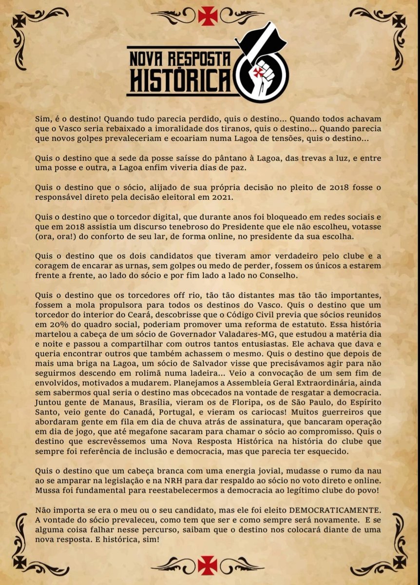 Movimento Nova Resposta Histórica publica nota: 'A vontade do sócio prevaleceu'