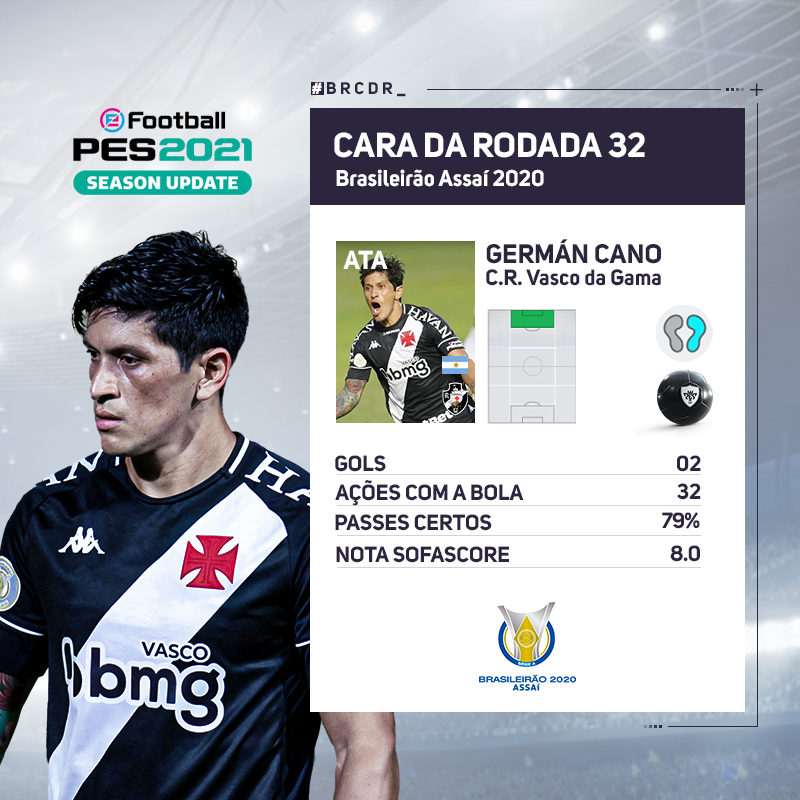 ? O artilheiro da Colina foi escolhido mais uma vez. Já são seis no total. Com dois gols e uma atuação fundamental para a vitória, @Germancanoofi venceu e é o meu 'Cara da Rodada' 32. Brilha muito, brabo com o @PES_Brasil! #BRCDR