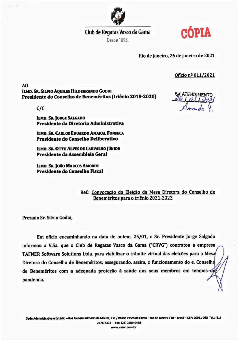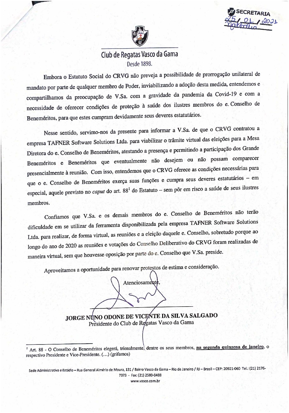 Salgado contratou a empresa TAFNER para que a eleição da nova mesa diretora do Conselho de Beneméritos seja realizada em ambiente virtual - a mesma que realizou a eleição dos Conselhos Deliberativo e Fiscal, na posse dos conselheiros na última sexta-feira.