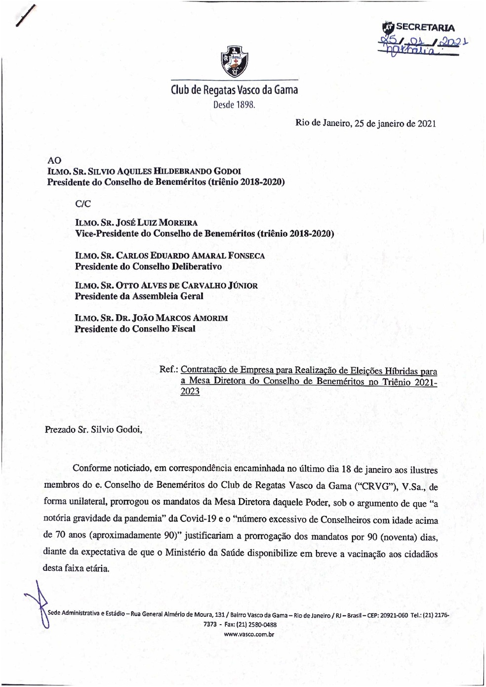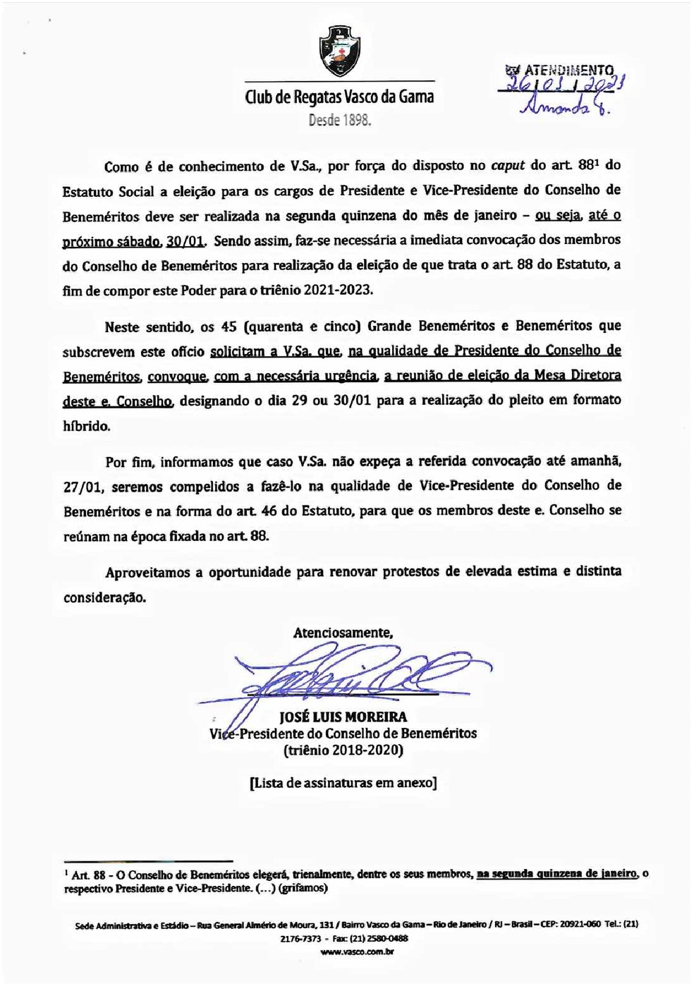 José Luis Moreira solicitou a convocação para que a nova mesa diretora do Conselho de Beneméritos seja eleita ainda nesta semana, apoiados no artigo 88 do estatuto do Vasco.