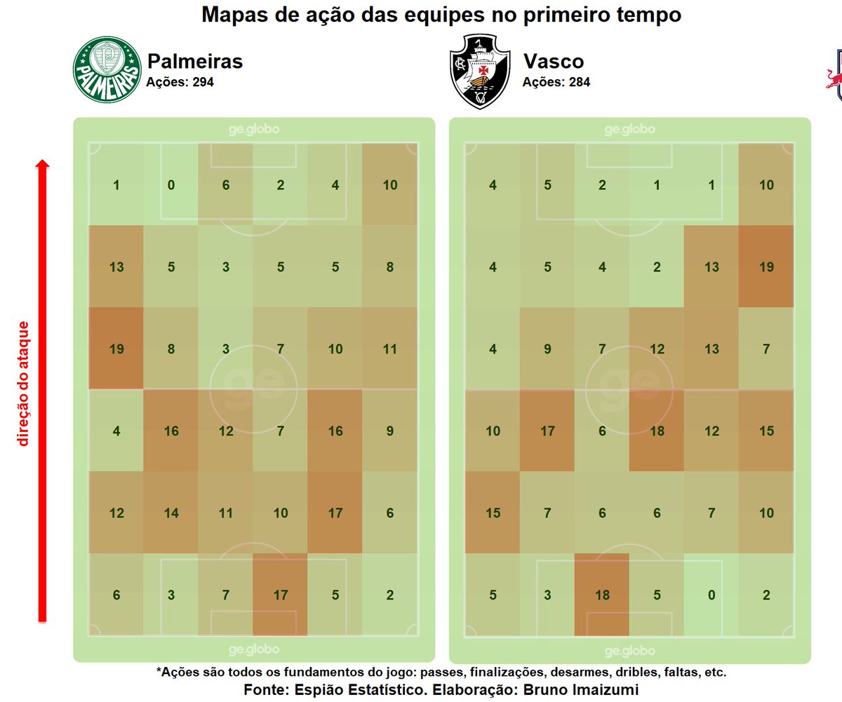 Os mapas de ação de Palmeiras e Vasco no 1ºT ressaltam a procura do jogo ofensivo pelo lado direito das duas equipes. Com a presença de Felipe Melo, o Palmeiras troca mais passes pela zona intermediária. #trpalestra