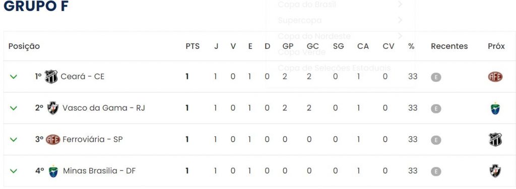Como todos os dois duelos do Grupo F saíram empatados – Vasco 2×2 Ceará e Ferroviária 0x0 Minas Brasília/DF – cada equipe somou um ponto. Dessa forma, o Vovô termina a primeira rodada na liderança de sua chave, seguido por Vasco (2º), Ferroviário (3º) e Minas (4º).