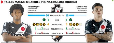 Gabriel Pec, aos poucos, pede passagem. E quem está vendo o garoto cada vez mais nítido pelo retrovisor é Talles Magno. O primeiro é reserva do segundo, mas tem acumulado bons momentos quando entra no decorrer das partidas sob o comando de Vanderlei Luxemburgo. Não será surpresa se a disputa pela vaga se acirrar até domingo, quando o Vasco enfrentará o Bahia, em São Januário.