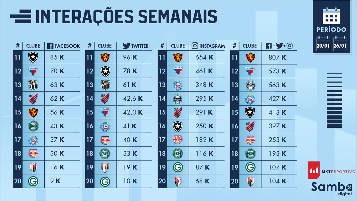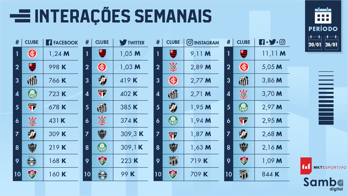 Após três semanas seguidas fora da liderança, o @Flamengo voltou ao topo. Com 11.11 milhões de interações, o Fla registrou aumento de 57.5% entre os períodos.