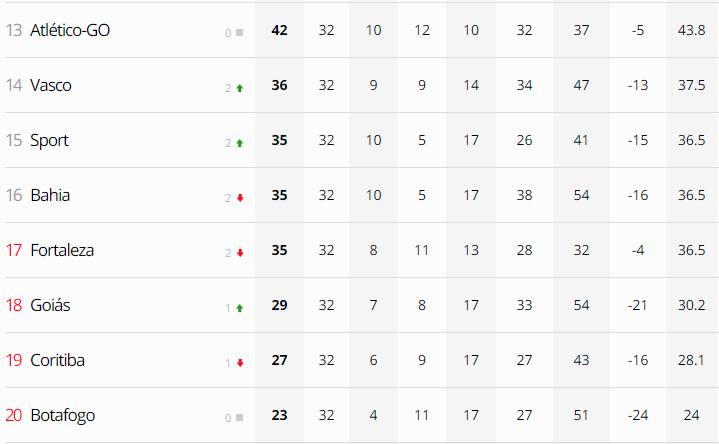 Em jogo atrasado da 30ª rodada do Brasileiro, realizado na noite desta 5ª-feira em Salvador, o Bahia venceu o Corinthians por 2 a 1 e subiu da 17ª para a 15ª posição, deixando a zona do rebaixamento. Com o resultado, a diferença do Vasco (que segue em 14º lugar) para o Z4 caiu de 4 pontos para 1 ponto. Neste domingo, às 16h, em São Januário, o Vasco recebe o Bahia.