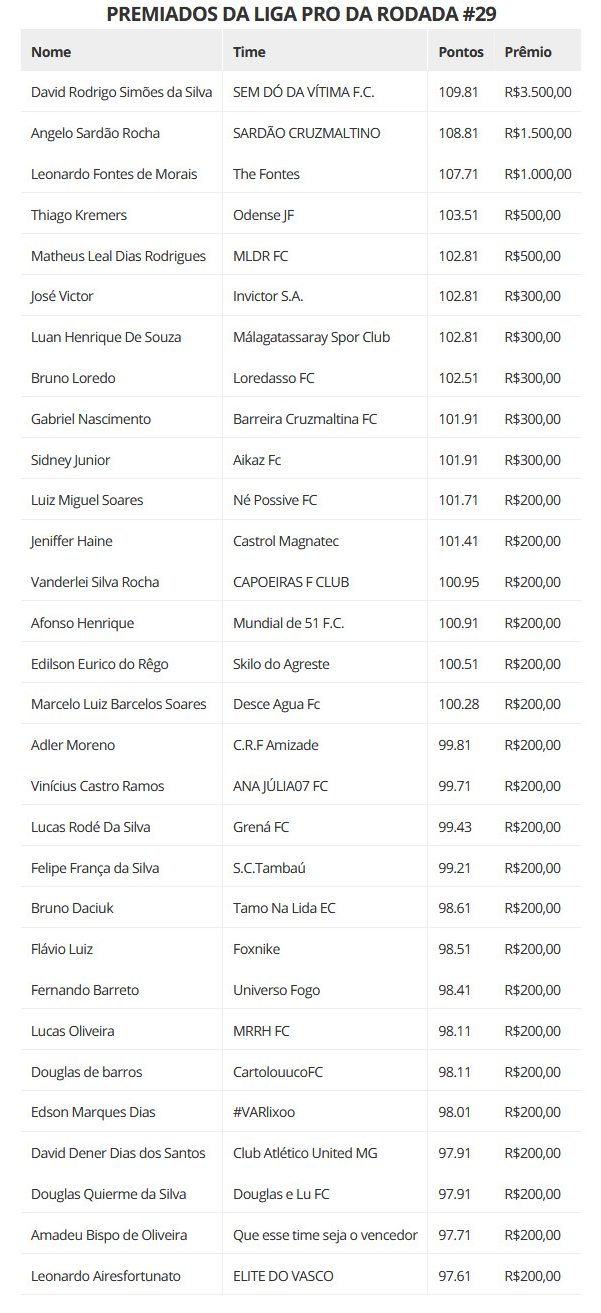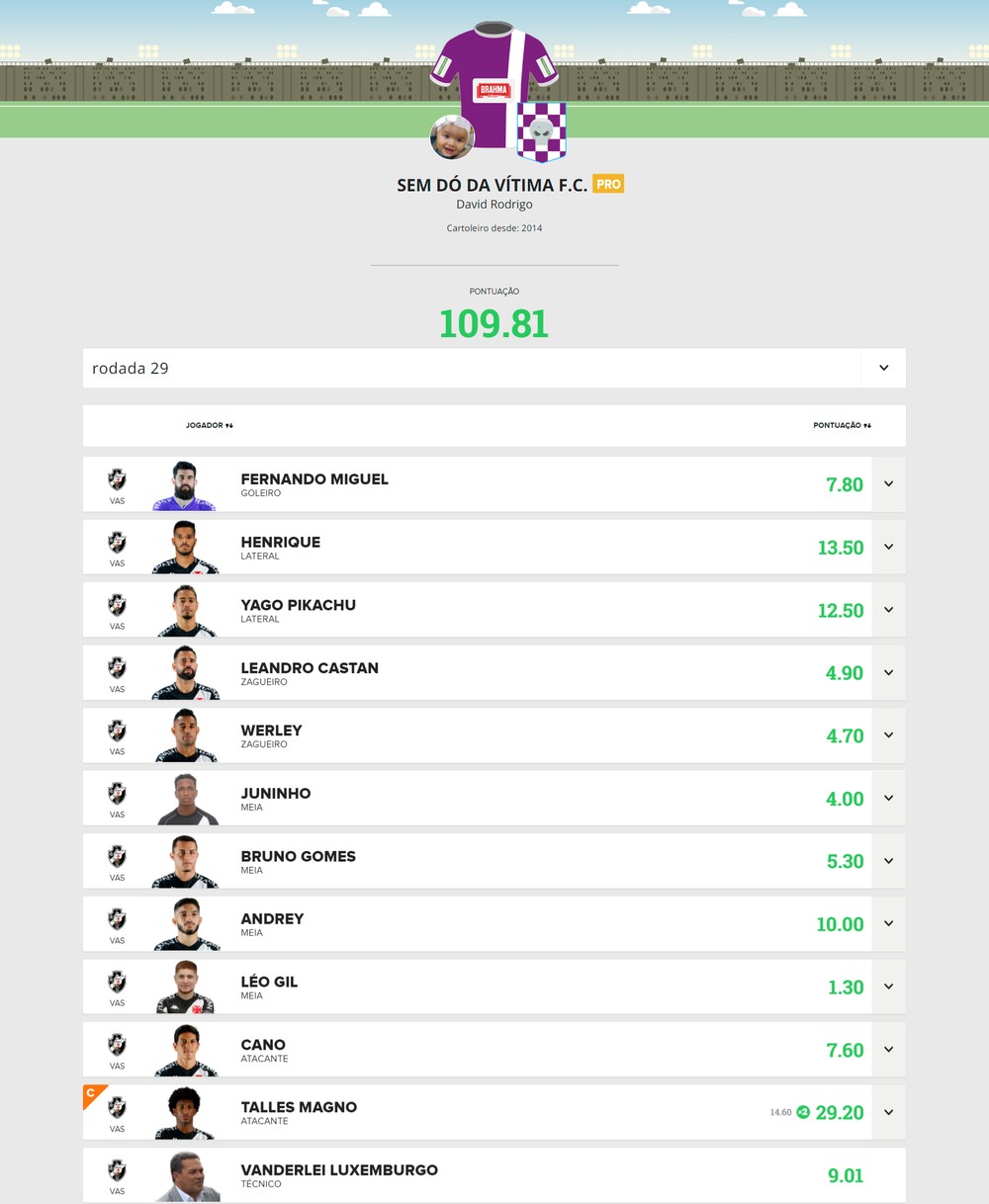 Na rodada #29 apenas Flamengo, Internacional e São Paulo estavam representados entre os mais escalados do Cartola FC. Mas o vencedor da Liga PRO nesta ocasião não escolheu nenhum jogador desses times. Na verdade, ele escalou apenas atletas de uma equipe: o Vasco. Graças a vitória do Gigante da Colina por 3 a 0 sobre o Botafogo no "Clássico da Amizade", David Rodrigo, dono do "Sem dó da vítima F.C." fez 109.81 pontos e faturou o prêmio de R$3.500,00 em vale-compras.
