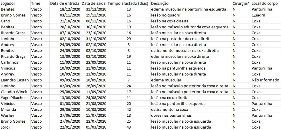 Envolvido na luta contra o rebaixamento, o Vasco precisa ter força máxima para garantir a permanência na Série A. Baixas por suspensão acontecem corriqueiramente, mas o time não vem sofrendo com lesões musculares. A última aconteceu há exatos 100 dias, quando Germán Cano apresentou problema na coxa direita durante o aquecimento realizado antes da derrota por 2 a 1 para o Corinthians, em 21 de outubro.