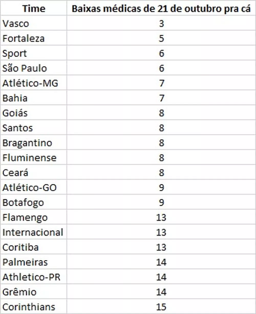 O Vasco é o clube que menos sofreu baixas médicas nos últimos 100 dias. Veja abaixo levantamento feito pelo jornalista Roberto Maleson, do Espião Estatístico: