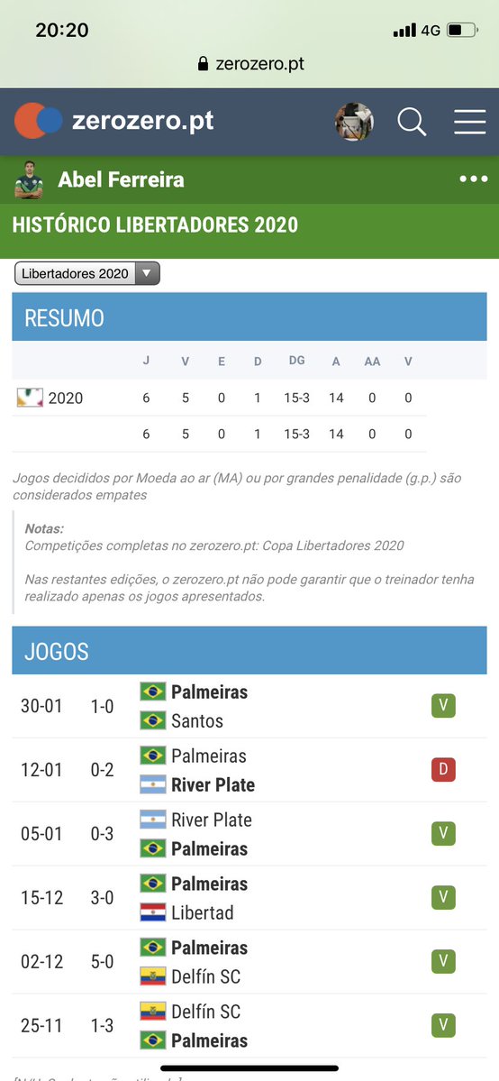 Campanha do Palmeiras na Libertadores com Abel Ferreira. Seis jogos: cinco vitórias e uma derrota - 83,3% de aproveitamento.