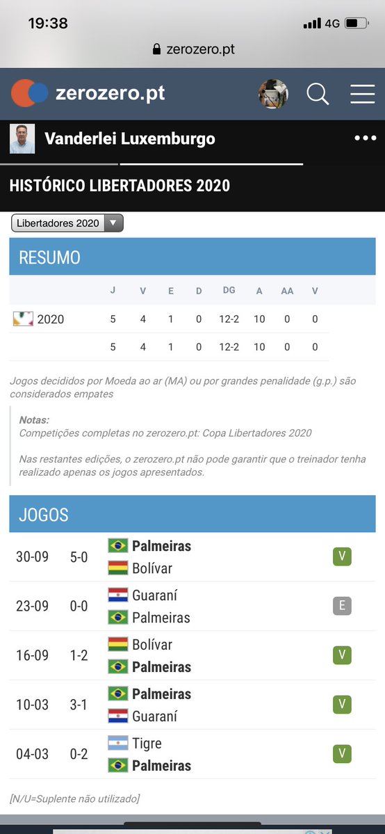 Campanha do Palmeiras na Libertadores com Vanderlei. Cinco jogos: quatro vitórias e um empate - 86,6% de aproveitamento.