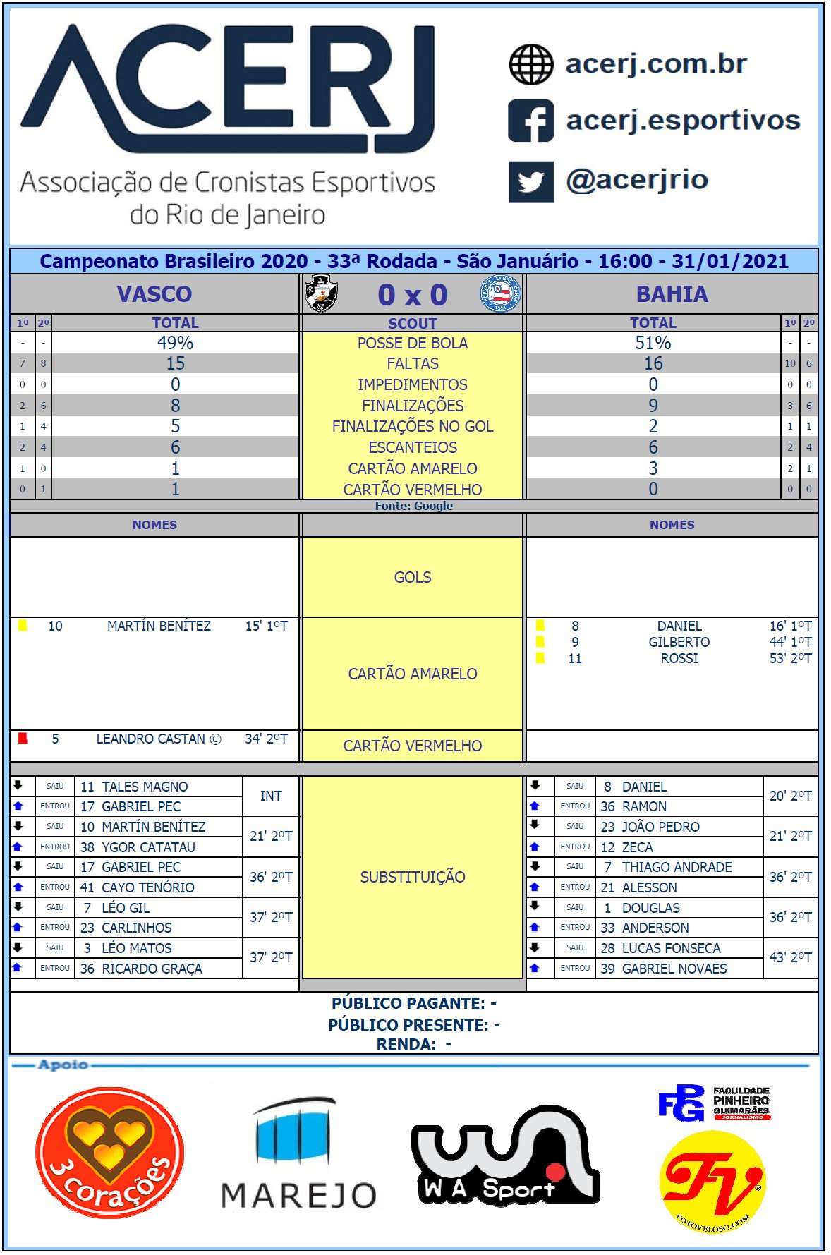 VASCO: Fernando Miguel, Léo Matos (Ricardo Graça), Leandro Castán, Marcelo Alves e Henrique; Bruno Gomes, Léo Gil (Carlinhos), Yago Pikachu e Martín Benítez (Ygor Catatau); Talles Magno (Gabriel Pec) (Cayo Tenório) e Germán Cano