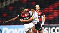 Aos 48, Léo Matos empurrou Bruno Henrique de forma bizarra na área e o árbitro Raphael Claus assinalou a penalidade após consultar o VAR.