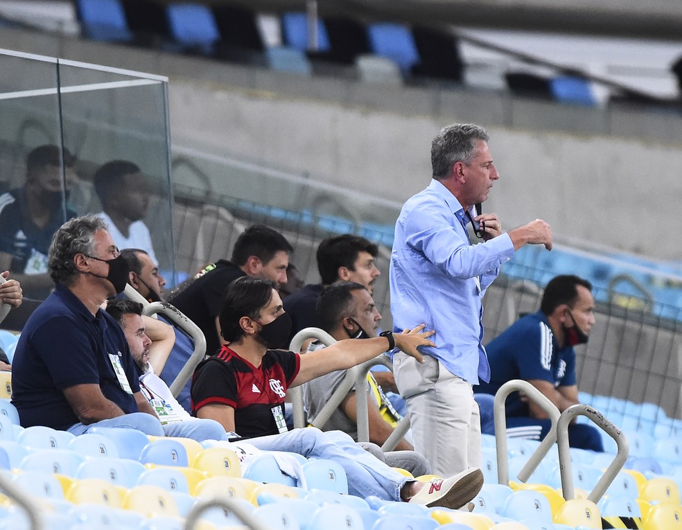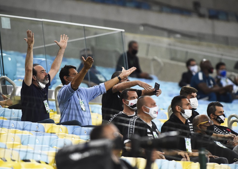 Do lado rubro-negro, com domínio no primeiro tempo, Landim se levantou pouco antes de comemorar o primeiro gol do Flamengo - no pênalti, pediu segundo amarelo para Léo Matos, que seria expulso. Fora este momento, os dirigentes e também os jogadores que ali assistiram a partida - casos de Diego Alves e Rodrigo Caio - só aplaudiram as ações do time e tentaram controlar Gabigol.