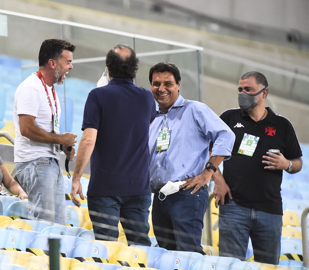 Antes da bola rolar, Rodrigo Tostes, vice de finanças do Flamengo, cumprimenta e conversa com os vascaínos Osorio e Duque Estrada |