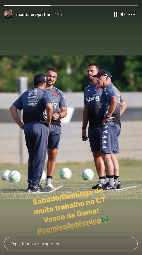 Auxiliar de Luxemburgo, Maurício Copertino publicou stories em sua conta do Instagram e destacou a dedicação nesta reta final do Brasileiro: "Sábado/Domingo de muito trabalho no CT Vasco da Gama", escreveu.