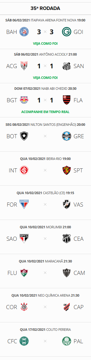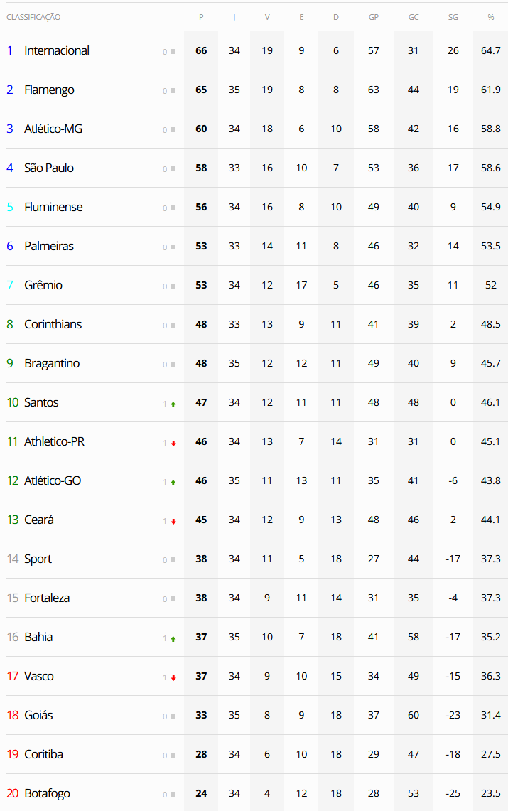 Terminados os jogos do fim de semana da 35ª rodada do Campeonato Brasileiro, o Vasco figura na 17ª colocação, ou seja, na zona do rebaixamento. O Gigante da Colina enfrenta o Fortaleza na 4ª-feira, às 19h15, na casa do adversário, e precisa pontuar para deixar o Z4.