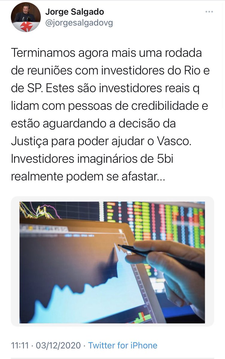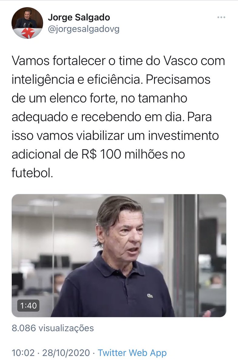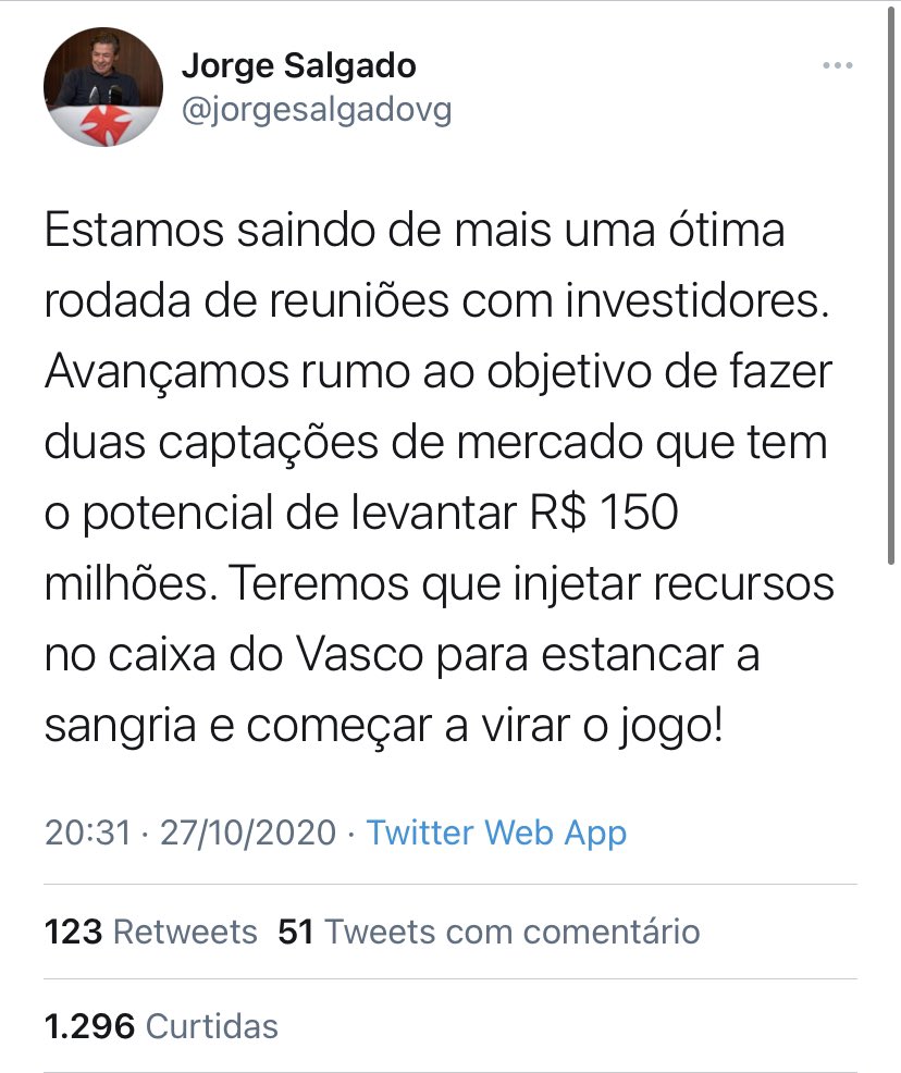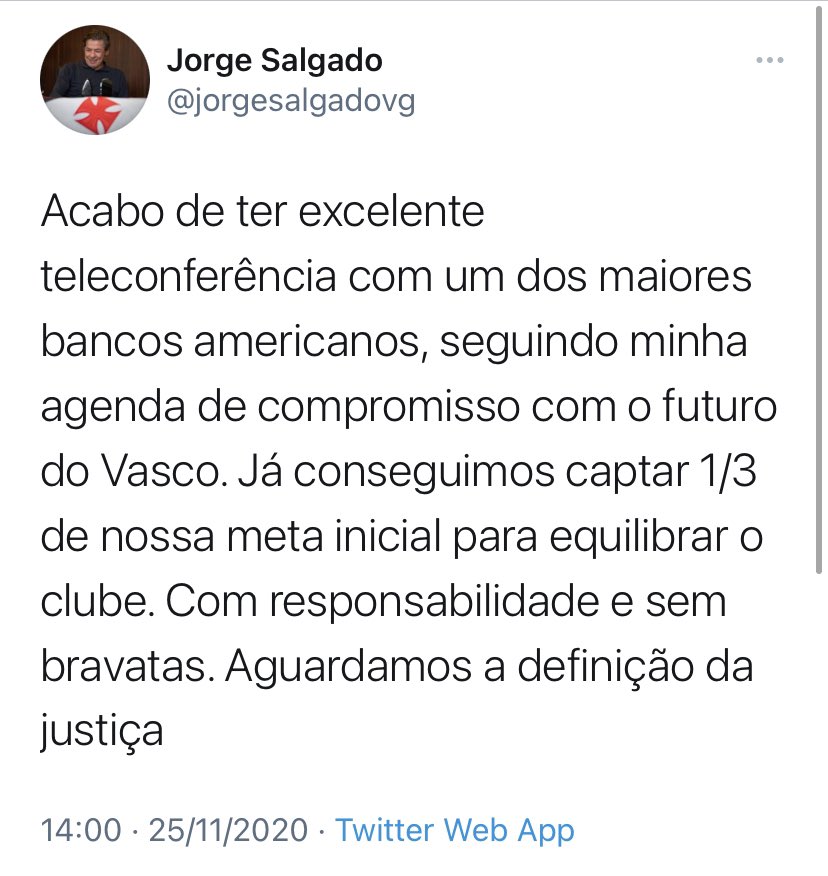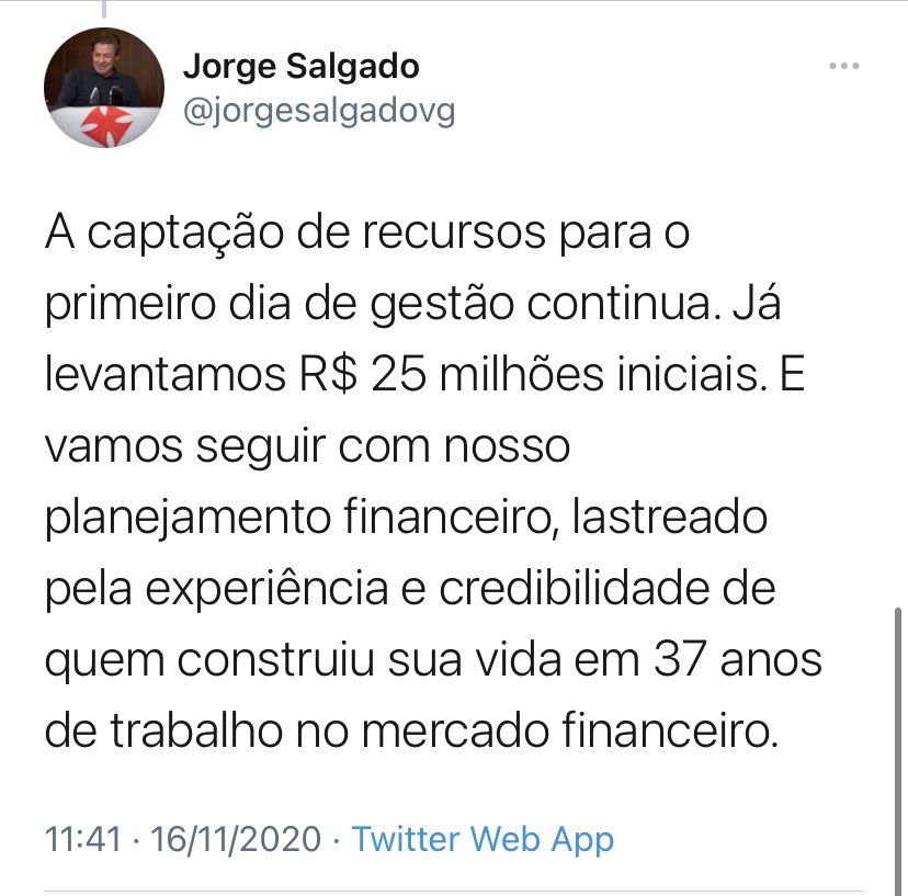 , em algumas oportunidades, que já havia levantado 25 milhões de reais para os primeiros dias de gestão na presidência do Vasco. Seria o aporte para organizar o clube. Mas isso não aconteceu. Entramos em contato com a assessoria de Salgado, mas ainda não obtive uma posição.