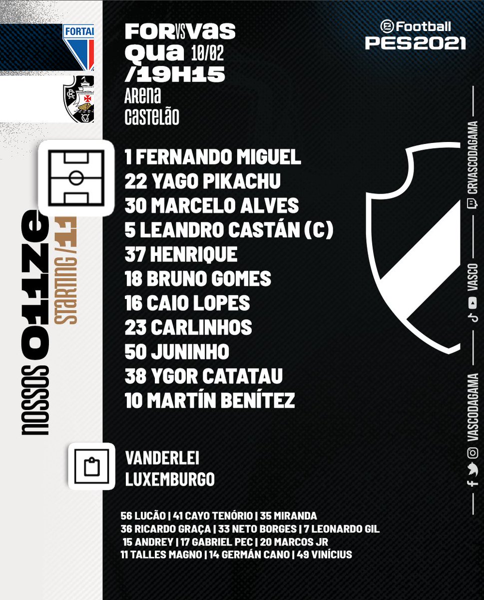 Confira a escalação do Vasco; Caio Lopes, Carlinhos, Juninho e Catatau são titulares e Cano é opção no banco