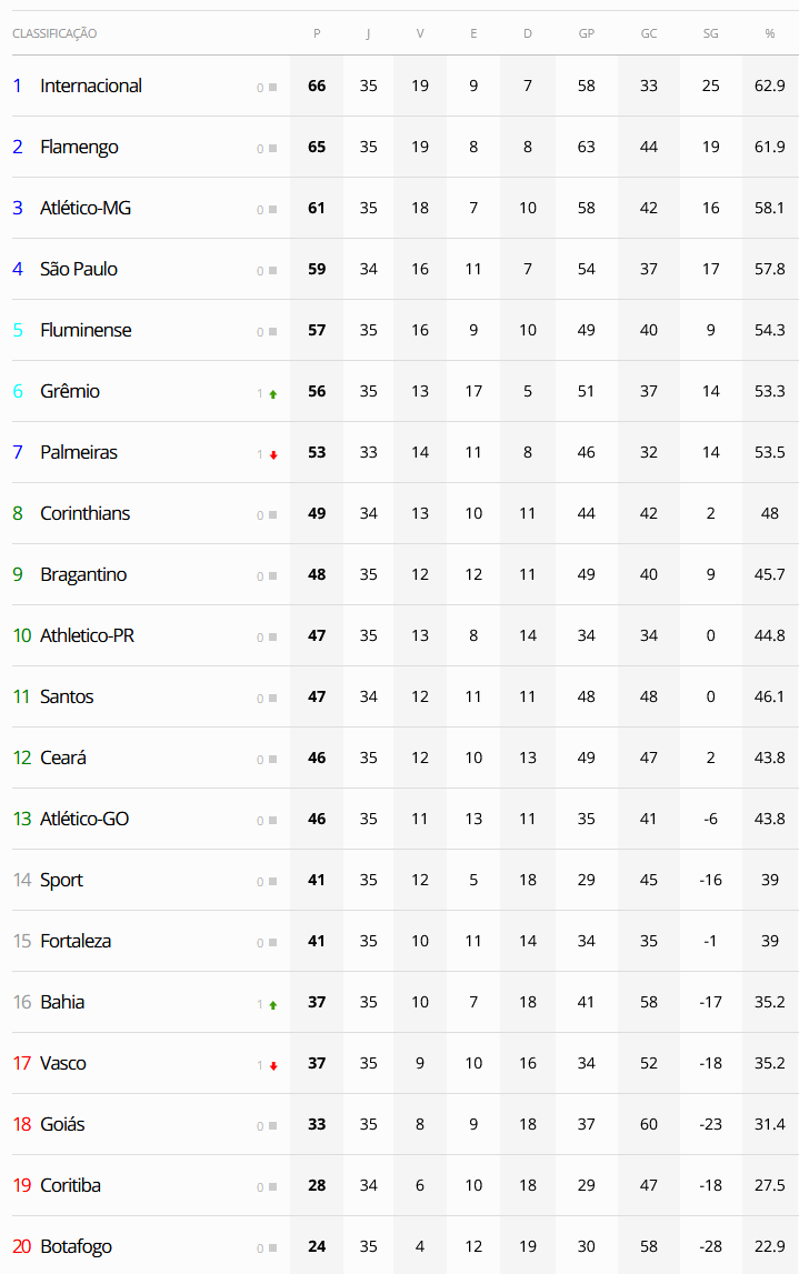 Faltando um jogo para o fim da 35ª rodada do Brasileiro, O Vasco, que perdeu para o Fortaleza por 3 a 0, está na 17ª colocação, dentro da zona do rebaixamento.